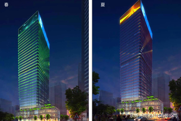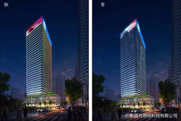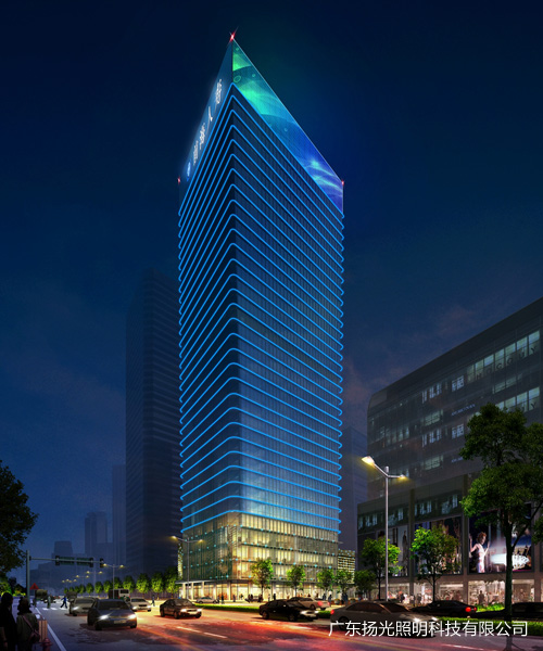 根據(jù)對建筑主體的解析,頂部在西北面設(shè)置LED顯示屏,東南面設(shè)置企業(yè)LOGO來增強(qiáng)建筑的標(biāo)識度,立面采用燈管色勒,有效的表現(xiàn)出建筑龍骨結(jié)構(gòu)的層次感,通過線條變化體現(xiàn)出城市高效發(fā)展的速度。