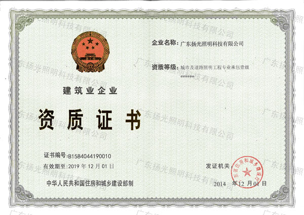 12月初,在廣東城鄉(xiāng)及住房建設(shè)廳領(lǐng)導(dǎo)的大力堅持下,經(jīng)國家住房和城鄉(xiāng)建設(shè)部審查核準(zhǔn),揚(yáng)光照明取得“城市及道路照明工程專業(yè)承包壹級資質(zhì)”。