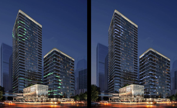 項(xiàng)目建筑與幕墻結(jié)構(gòu)以流暢線條與疊加元素為核心設(shè)計語言,既賦予建筑向上生長的蓬勃張力與豐富的空間層次感,又以靈動曲線勾勒出輕盈飄逸的動態(tài)美感。為呼應(yīng)這一獨(dú)特的建筑風(fēng)格,我們的設(shè)計師們以燈光為創(chuàng)意畫筆,沿建筑結(jié)構(gòu)逐層鋪陳光亮,讓夜幕中的建筑呈現(xiàn)出層層遞進(jìn)、疊加累積的燈光韻律。