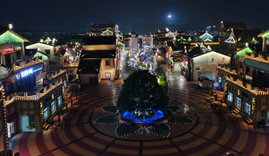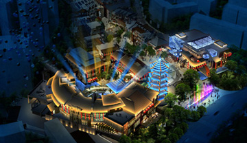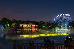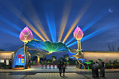 運(yùn)用多種科學(xué)的照明手法,勾勒其形象、豐富色彩,提升園區(qū)檔次,增加其夜間經(jīng)濟(jì)效益。入口位置安裝空中玫瑰,七彩的空中激光束不僅活躍入口環(huán)境氛圍,還起到區(qū)域定位引導(dǎo)作用,吸引周邊旅客的光顧。